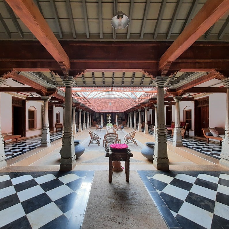 Open since 2010, the property’s restoration was completed by French architects. Built in 1905, Saratha Vilas is one of the most beautiful palatial homes among the 10,000 to 15,000 mansions built by the Chettiar community of Hindu bankers and merchants between 1850 and 1950 in southern Tamil Nadu.
