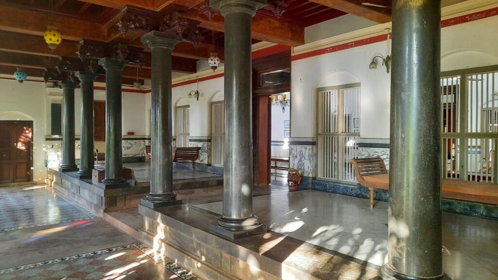 La véranda monumentale à l’entrée est ornée de colonnes de marbre sombre, le grand hall d’apparat est couronné par une charpente en bois ciselé et peint dans des teintes délicates, la cour centrale est rythmée de piliers sculptés dans le style des temples dravidiens, la salle à manger est entourée d’arcades aux corniches soulignées de frises faites au pochoir.