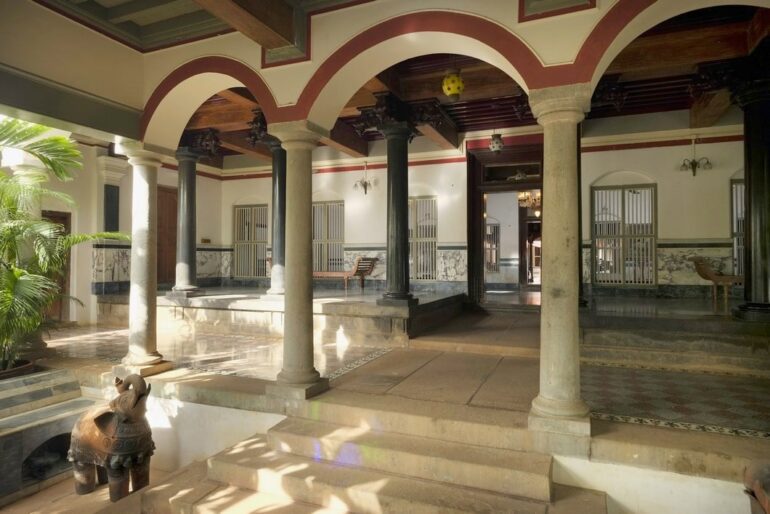 The main verandah at the entrance of the mansion, guarded by columns of dark marble, opens into a grand hall crowned with chiseled woodwork painted in delicate colors. In contrast, the open-air central courtyard is surrounded by carved granite pillars in the style of Dravidian temples. Finally, it is an arcade of heavy stone columns that support the spacious dining room’s ceiling with its decorated cornices. The ceiling is made of a pressed metal imported from England.